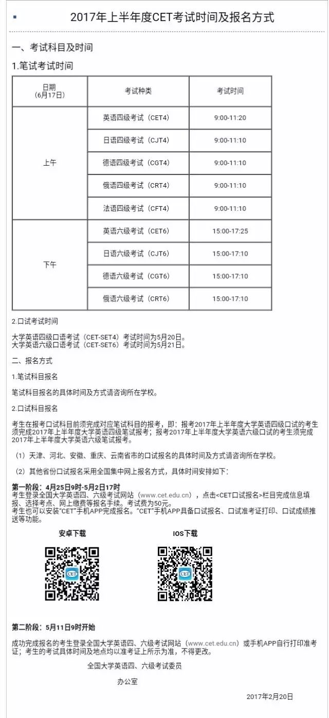 2017年上半年四六级笔试时间为6月17日!
