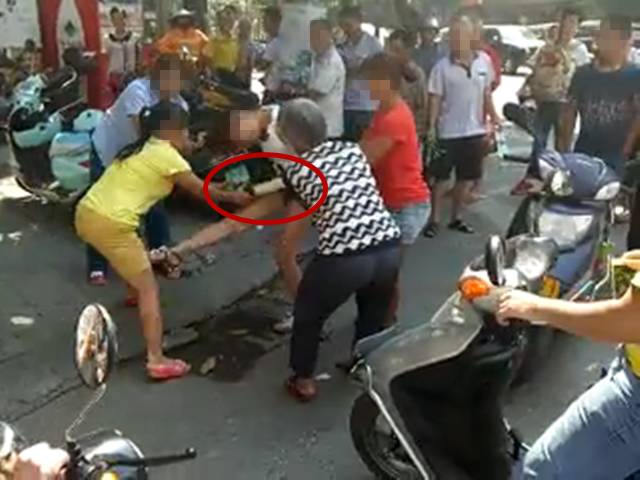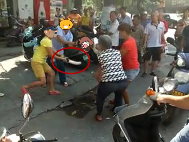 天啊,大街上人来人往的,这样真的好吗?围观的群众也不少,但为什么没有人上去劝架?被打女子只能全力回击用脚踹开~