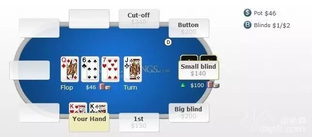 转牌为:J♣ ,他过牌,你下注30刀,他过牌-加注到100刀