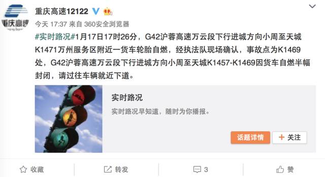 网友爆料:今天(1月17日)下午17:00点多,沪蓉高速G42云阳到万州路段,一辆满载新车的板车突然起火自燃,数辆新车被波及!事故发生后,相关部门第一时间赶赴现场。由于起火事故的影响,造成了该路段严重的交通堵塞,据说沿线车辆从万州堵到云阳!