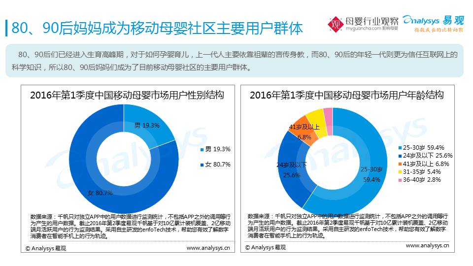 刚刚提到“进化”实际上是母婴群体的进化,这个群体之所以引起大家如此的关注,之所以成为互联网的一个最重要的命题,实际上来自于母婴用户的结构是什么样子的。从性别上来说,虽然有很多奶爸,但是妈妈仍然是主体。更值得关注的是年龄,24岁以下的占25.6%,25-30岁占59.4%。30岁以下的群体购买的产品除了母婴还有很多。