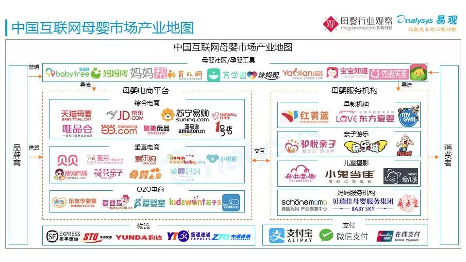 上图,我们会看到母婴社区和孕婴工具实际上是最直接的打通渠道,而母婴社区和孕运工具往下走既可以成为流量来源,也可以为线下的母婴服务机构导流。中间核心的两个部分——母婴电商平台和母婴服务机构,实际上代表了今天我们说的母婴产品和母婴服务的一个部分。母婴电商平台包括:综合电商、垂直母婴电商,也会包括O2O,线上与线下相结合的电商模式,这是今天互联网母婴市场的一个产业图谱。