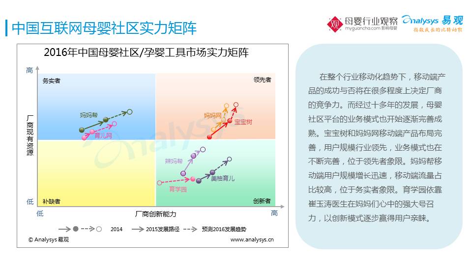 纵轴代表的是母婴社区占据多大的市场空间和份额,横轴是创新能力,所以会交叉出来四个象限——领先者、创先者、补缺者和务实者。最终看到这些处在“领先者”或者是在创新能力比较靠前的母婴社区,最终都吻合以下几个趋势:
