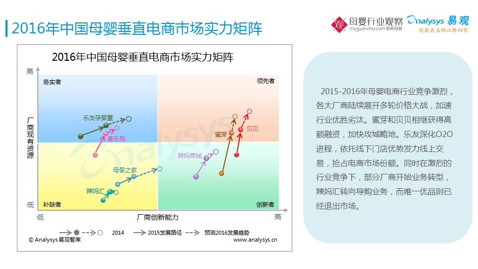 回到母婴电商市场的实力矩阵,可以看到现在市场领先的是贝贝网、蜜芽和乐友。从创新上,贝贝和蜜芽仍然处于相对领先的状态,它们都有不同的特点,无论是做平台特卖、跨境特卖、O2O等,这也是代表了今天主流母婴电商发展的模式。