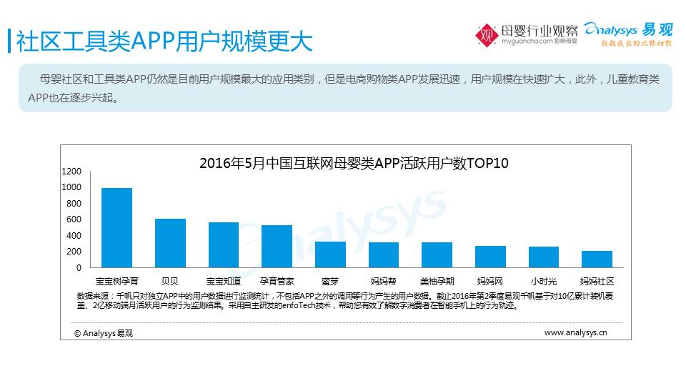 从用户规模上看,这是母婴APP活跃数TOP10。社区类的,工具类的,依然是今天占据用户规模最大的一个类别。这张图代表了:①母婴用户的规模是在扩大的,我们仍然有千万规模的母婴APP。②社区仍然是最大众的一类群体。