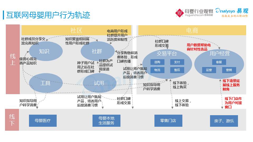 为什么把互联网母婴拆解成“社区”和“电商”两个比较大的部分?因为在母婴这一块,大的拆解是“线上”和“线下”。但是线上的两个部分,“社区”和“电商”是相互扭转的过程。没有一个公司、没有一个产品,它绝对意义上只做社区或者是只做电商。后面我们提到的很多企业,也许它起家的时候实际上是社区,但是在延展产品和服务的时候,需要去向“交易”的环节去走,“交易”始终是最后一个环节,这些企业也希望提高对用户的抓力和黏性,所以做了社区的产品。所以整个环节没有区隔,而是一个相互扭转的过程。