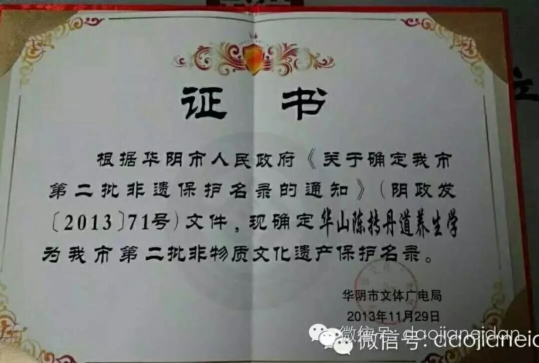 、老子秘传道家内丹功,当代158岁吴云青”的事迹以来,海内外各有识之士,纷纷而至学习吴云青老人内丹养生之法。直至2010年央视播出吴云青《肉身不腐之谜》记录片后再次火爆,并于近年被华阴市下红头文件列为华山非物质文化遗产,成立陈抟丹道非物质文化遗产保护中心!每月在华山,广东等地举办三到五天面授学习。