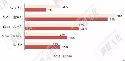 你的薪资是“抱大腿”还是“拖后腿”?根据前程无忧2016年调薪满意度调查,职场人的主力薪资段集中在3000—7000元这个范围,其中35%的受访者月薪在3000—5000元,23%的受访者月薪在5000—7000元。月薪过万的受访者比例为15%,与2015年相比上升了4个百分点,而月薪在5000元以上的人群与2015年相比也增长了9个百分点。(见图2)