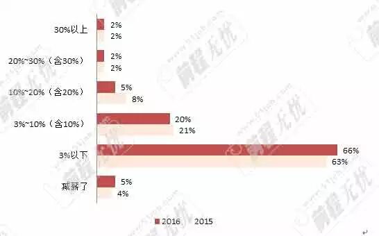 根据前程无忧2016年上半年所做的调薪满意度调查结果显示,2016年职场人的涨薪幅度缓慢,近9成的受访者涨薪幅度在10%以下,66%的受访者表示只涨了3%以下;而涨薪幅度在10%~20%的人群比2015年减少了3个百分点,仅为5%;更有5%的受访者表示尝到了减薪的滋味。(见图1)