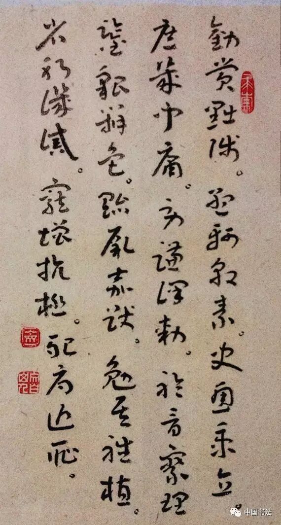 其实,这两种方法和通临字帖法并不矛盾。因为学习字帖,就要尽量多看所学书家对每个字的书写,不可能只学他几个字而置其它字不顾,通临是必须的。只是在时间和顺序上有所调整罢了。初学生疏,如果按帖顺序一字一字接着写下去,短时间内对每个字的印象就不深刻,容易行成抄写字数。不如先多写多复习某几个字,写熟了,记住了,就会把感性认识升华到理性认识。再去写另外的字,从观察到模仿,就有了更尖锐的眼光和更接近字帖的尺度。待这种经验和体会积累多了,就会减少盲目盲动。那时,不仅要通临字帖,就是帖上没有的字,也要设法去琢磨去研究了。关键是先要找个尽快入贴的突破口,才能少走弯路。而“逐字过关温习法”和“以点带面选临法”就是很有成效的临帖法,不妨照做。