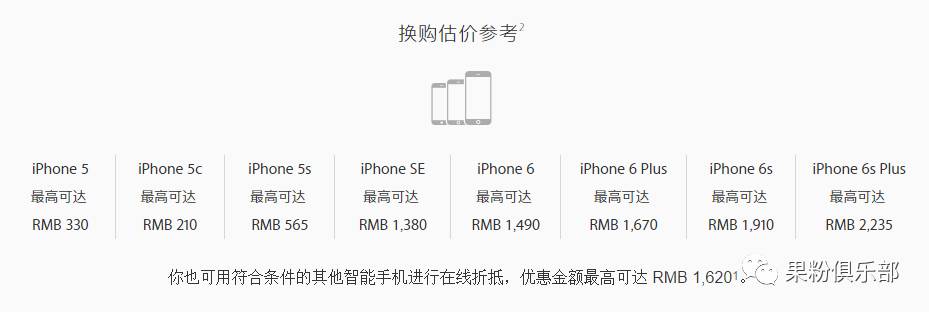 从苹果官网提供的信息来看,支持的以旧换新机型包括:iPhone 5(最高330元)、iPhone 5c(最高210元)、iPhone 5s(最高565元)、iPhone SE(最高1380元)、iPhone 6(最高1490元)、iPhone 6 Plus(最高1670元)、iPhone 6s(最高1910元)、iPhone 6s Plus(最高2235元)。
