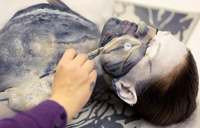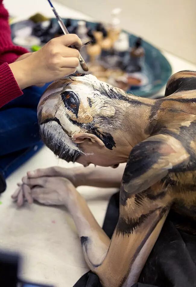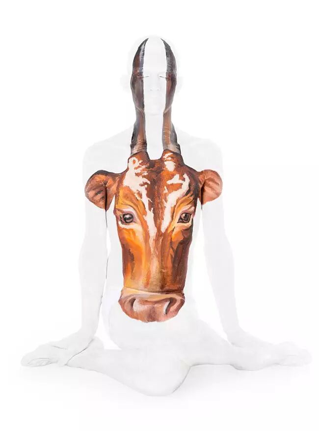 费伊需要花费数个小时,才能利用水基涂料将模特变成逼真的动物,比如这个人体牛头。