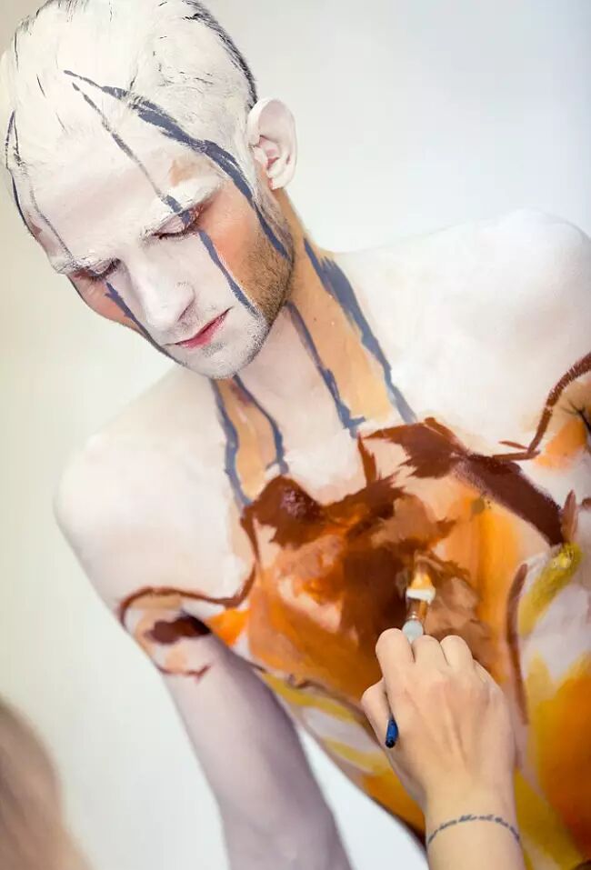 当费伊在模特身上绘制牛头时,模特需要保持一动不动。