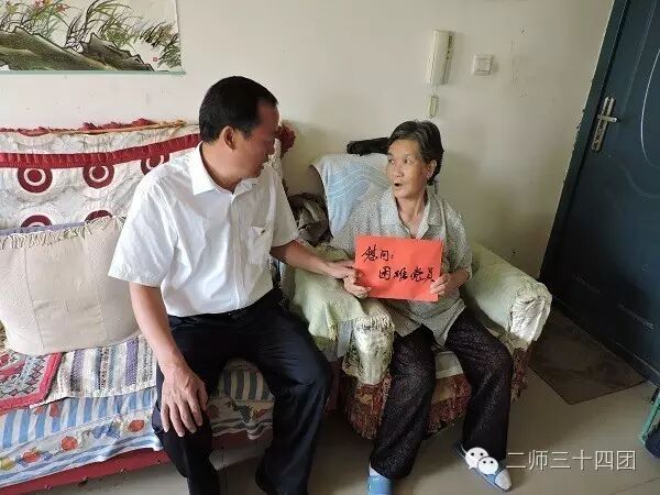 在庆祝建党95周年来临之际,三十四团党委常委副团长顾义带领社区党支部书记一行三人来到居民家中看望慰问社区困难老党员。(张小伟)