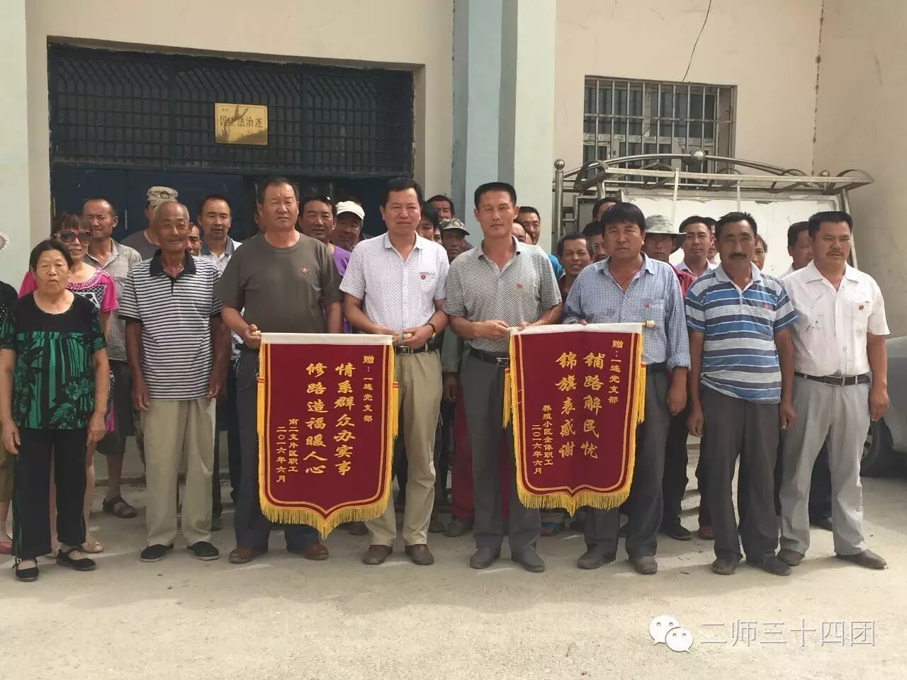 6月30日,34团1连职工群众给该连联合党支部送锦旗表谢意(摄影:黄敏丽)