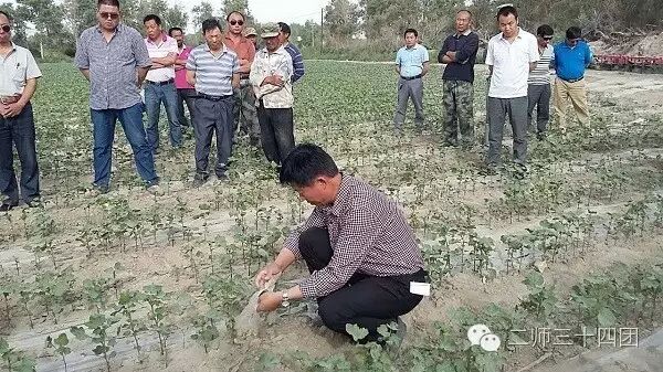 34团科技在线,34团副团长陆民组织全团召开农业技术现场会,重点强调棉花苗期管理和机械切边膜、揭膜技术要求。(摄影:刘丽霞 胡黎涛)
