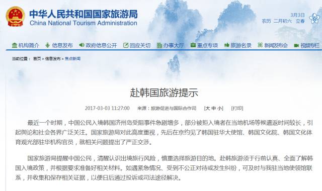 国家旅游局提醒称,最近一个时期,中国公民入境韩国济州岛受阻事件急剧增多,部分被拒入境者在当地机场等候遣返时间较长,。国家旅游局对此高度重视,、韩国文化院、韩国文化体育观光部驻华机构官员,就相关问题提出了严正交涉。