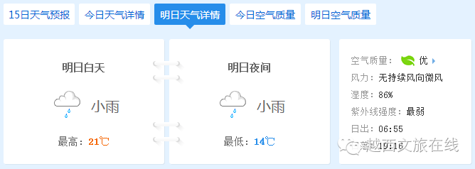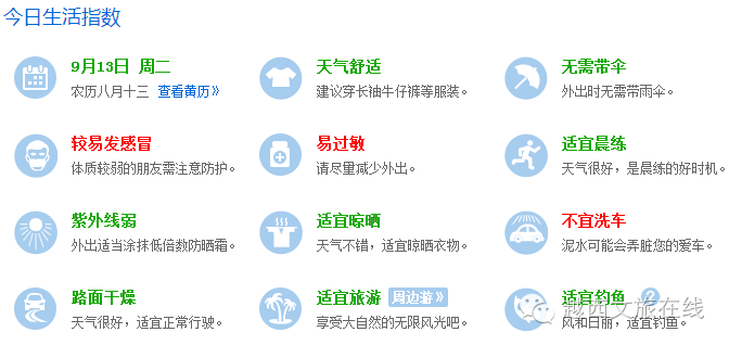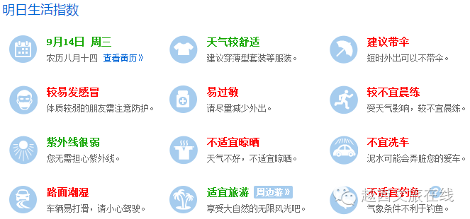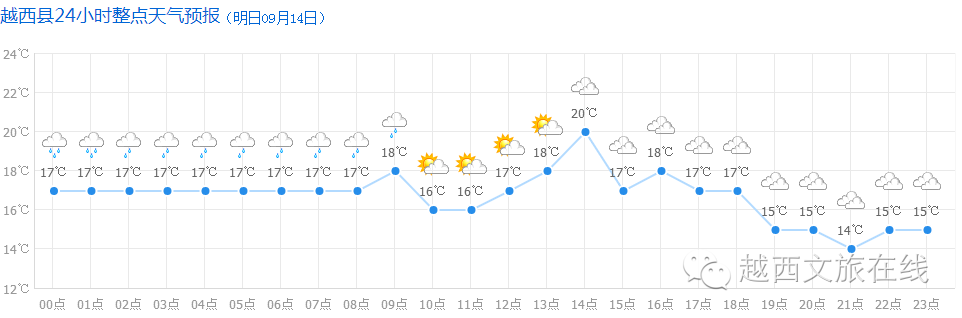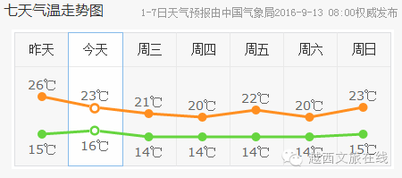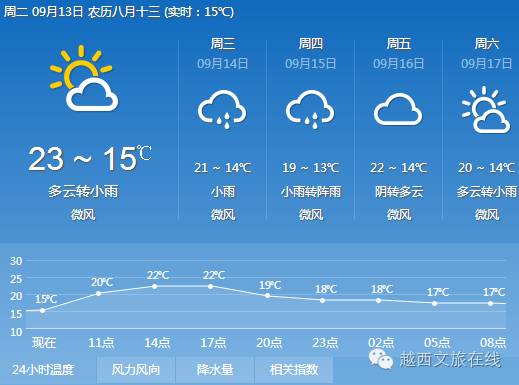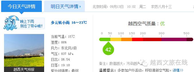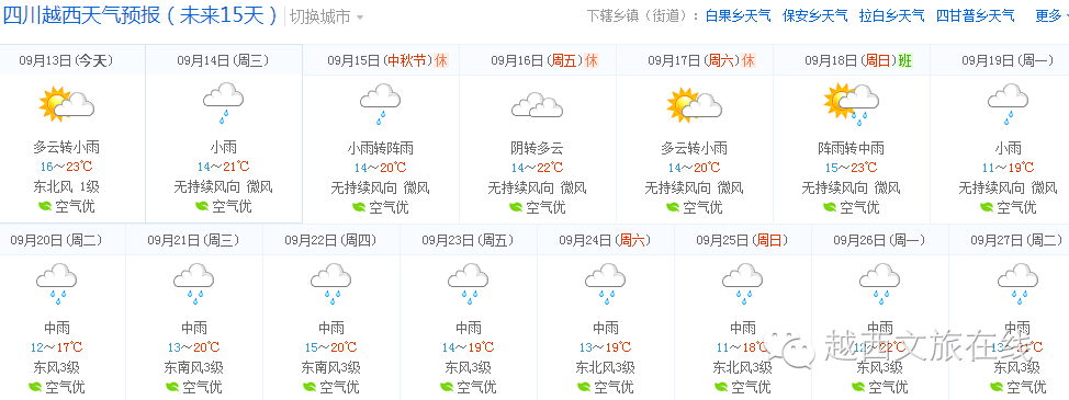 今天是9月13日星期二,农历八月十三。气温宜人,白云朵朵,没什么风。可以出去走走。明天会比今天热很多,有小雨,记得带伞。接下来的越西天气一周,白天平均气温21℃,夜晚平均气温14℃。