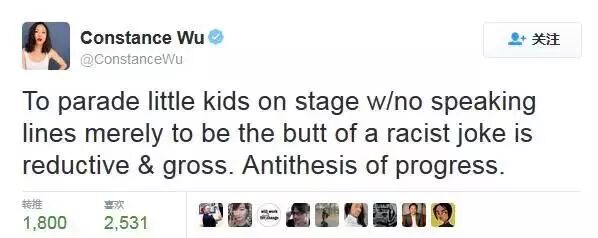 主演美剧《初来乍到》的华裔演员吴恬敏(Constance Wu)说:“让三个小孩子上台,不让他们说话,充当段子的笑柄,这是倒退,令人作呕,是站在进步的对立面。”