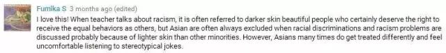 喜欢这个演讲。当老师讲到的时候,总是会提到黑人有权获得平等的待遇,但亚洲人却总是会被排除出和种族问题的范围,因为他们的肤色更浅。然而,亚洲人确实被区别对待,而且听到那些刻板印象的老套笑话时也会觉得不舒服。