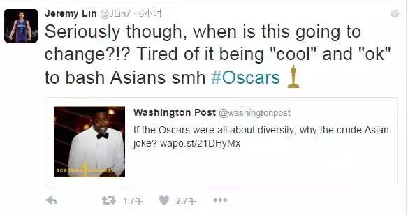 篮球运动员林书豪在推特抱怨:“说真的,这种情况什么时候能得到改变?!试着对亚裔好一些行么?”