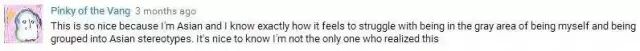 这个演讲很好。因为我是亚洲人,我清楚地知道这种与被归为灰色地带和被标上亚洲人刻板印象作斗争的感受。很欣慰并不是我一个人意识到了这点。