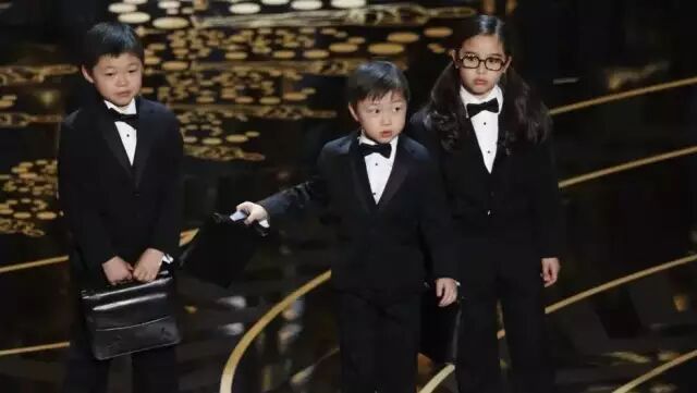 颁奖礼当晚,三名亚裔小孩被请上舞台,他们穿黑色西装打着领结,手里还各拎着一个黑色公文包。