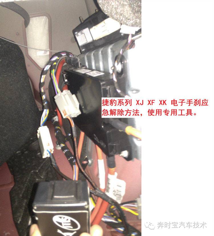 捷豹系列电子手刹的解除方法,捷豹解除需要通过专用工具,把在电子手刹模块的插头拔下,通过专用工具对接线束(两个插头),按专业工具的按钮,解除。(原理是改变电流的方向,使电机反向运行 ):