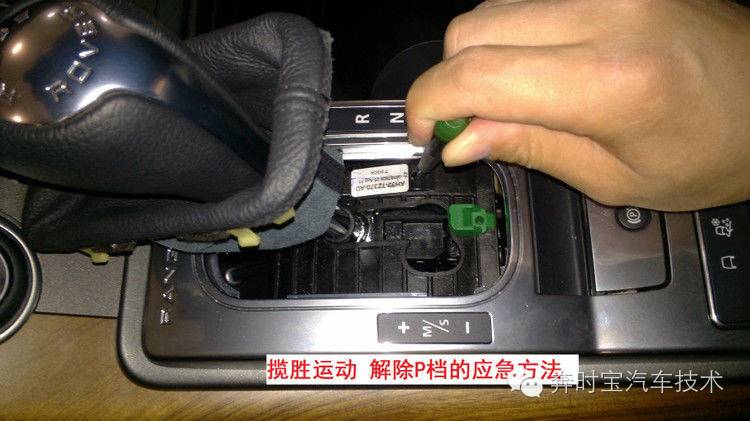 揽胜运动的P档的应急解除方法,有个小孔,通过工具下按: