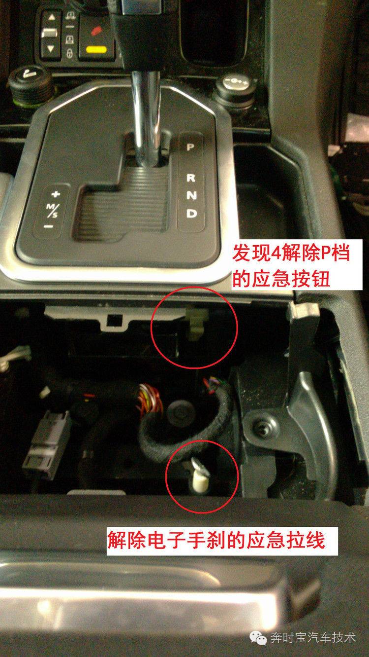 陆虎 神2 P档的应急解除位置,从图中红圈内有个黄色的机构,通过工具或手向下按: