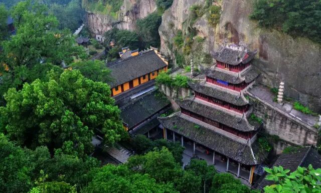 丹色石崖妆点翠色叠嶂,上善玉带环绕灵佛金山。在千百珍稀古木环绕,数片湖面莲池的簇拥中,整个大佛寺景区美景殊胜,令人流连忘返,魂牵梦萦,为浙江省省级风景名胜区。