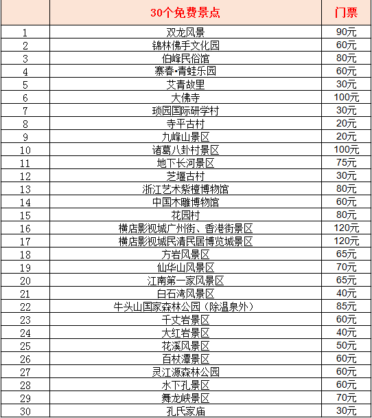 2016年9月11日至30日期间,西安市居民凭身份证一律免门票游览金华双龙风景区、横店影视城、诸葛八卦村等30个景区。