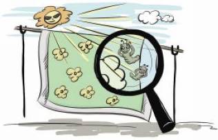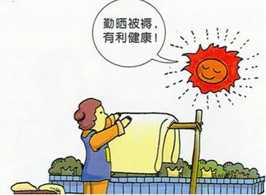 3、晒被子时,为了避免日光直射,所以可用床单罩著,但中途要将被子翻面,使两面都能均匀的晒到阳光。 木棉为一周两次,晒三~四小时太阳。合纤棉为一周一次,晒二~三小时最理想。