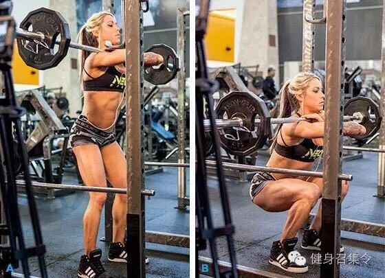 抬头挺胸,腰背腿发力,蹲下的过程中注意臀部后移,膝盖不超过脚尖可减小膝关节压力,大重量练习时偶尔超过也可接受。这个动作能锻炼到全身几乎大部分的肌群,同时也能刺激性激素的分泌,小火车开过来了,闲人避让……女性如果刚开始训练,难以完成杠铃深蹲,可改用高脚杯深蹲的方式完成,同样对于大腿的塑形有着很好地效果。