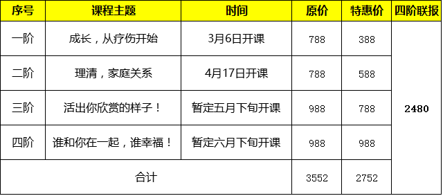 PS:此课程为“新启程”情感疗愈第一阶课程,四阶联报学习完整课程有优惠哦~