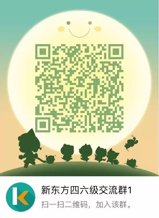 你是否已经跃跃欲试了呢,还在等什么,加入新东方在线四六级大家庭,在严寒冬日里大家一起交流分享吸取通关经验,早些和四六级说分手吧,主页君相信每一个努力的你运气都不会太差!加油喽!不要忘记扫码哦^^