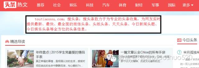 2、搜头条(http://www.toutiaosou.com)致力于为专业的头条收集,为网友实时提供最新、最快、最全面的微信头条、头版头条、天天头条、今日新闻头题、今日娱乐头条等全方位的头条信息。