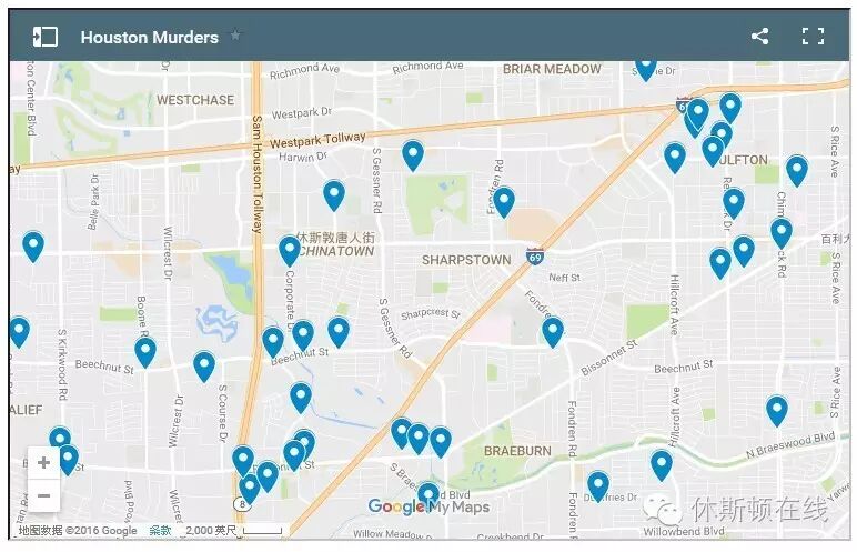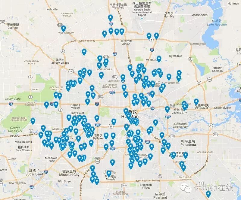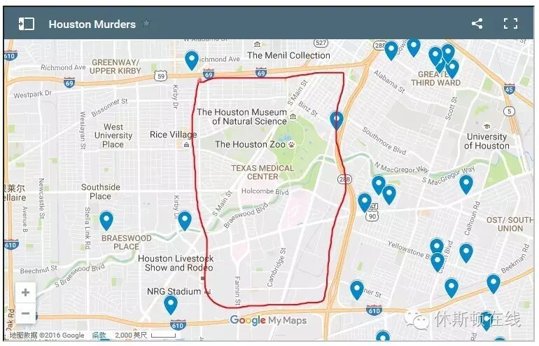 编者注:从地图上看,中国留学生、访问学者、研究人员聚居的德州医学中心、莱斯大学、博物馆区的治安良好。房价高昂的West University地区治安也相当好,虽然本周刚刚发生了伤9人的枪击案。288高速以东治安明显不佳,房价相应也低。