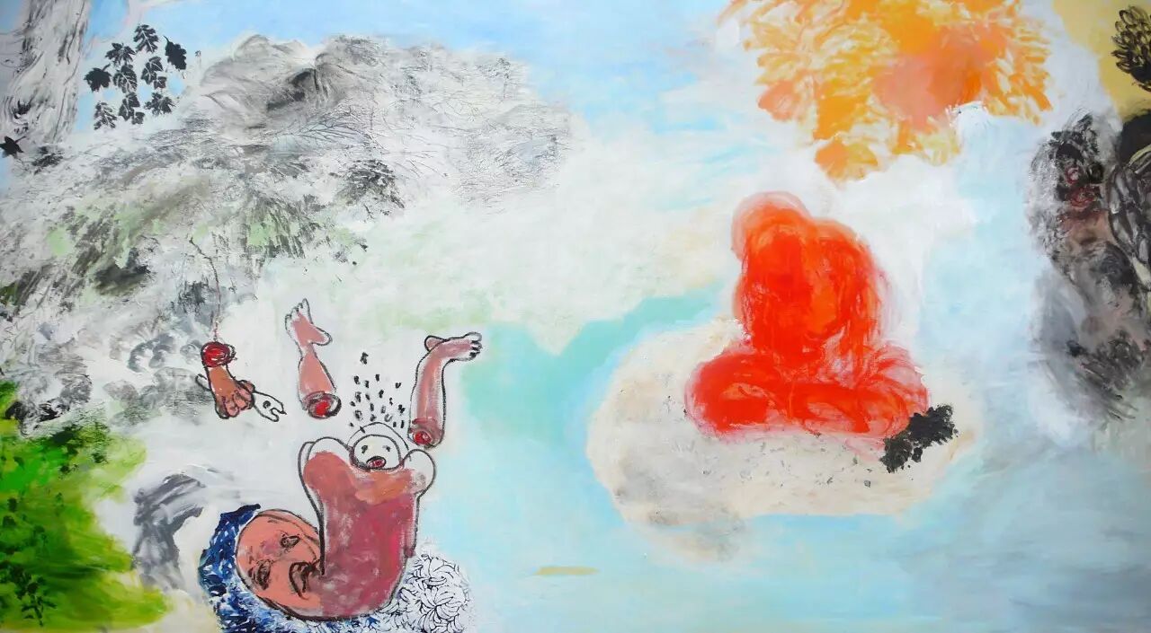 她在北京的时日,住在后海湖畔,那里波光滟影,一到夜晚,竟有些江南的旧风景,灯笼静挂、船桨潜行,坐在食肆二楼的窗前,是容易出神的。一个小朋友向她“谄媚”,称她是“倾国倾城貌,祸国殃民身”,语虽夸张,我们几个听者,倒很激赏,拍桌拊掌,笑翻一片。肖鲁有一次在机场,忽然停下来对冰逸说:“我算明白了,冰逸,你就是一个狐狸精!” 冰逸倒也磊落,说,这是对我最中肯的评价。此次冰逸的个展,主要一幅作品就借助了聊斋“荷花三娘子”的典故,这个狐精有三次变化:成莲、成石、成人。将一段痴情演绎得栩栩动人。冰逸的这幅作品就围绕着这样三个结构,取名叫:我感到蓝花在我身上开放。其中的美感,是至情至性的,将东方古典主义、文人画、隐秘的私情、时事掌故全都“搅和”在一块。我能感受到她的魄力,小手抡起、一挥,当代艺术就在她的“狂想”下诞生、成立。艺术家的自信建立在对东西方文化的通吃、圆熟、互文之上。