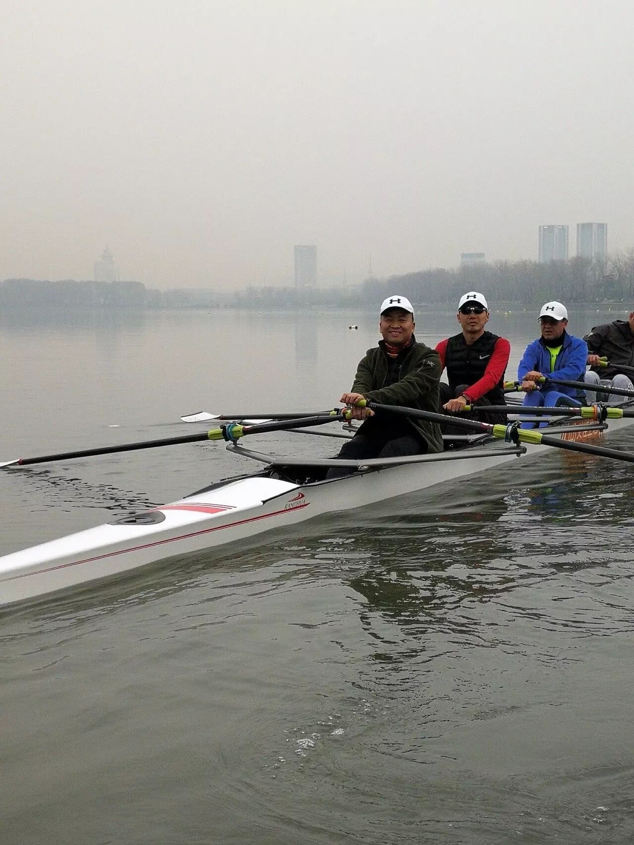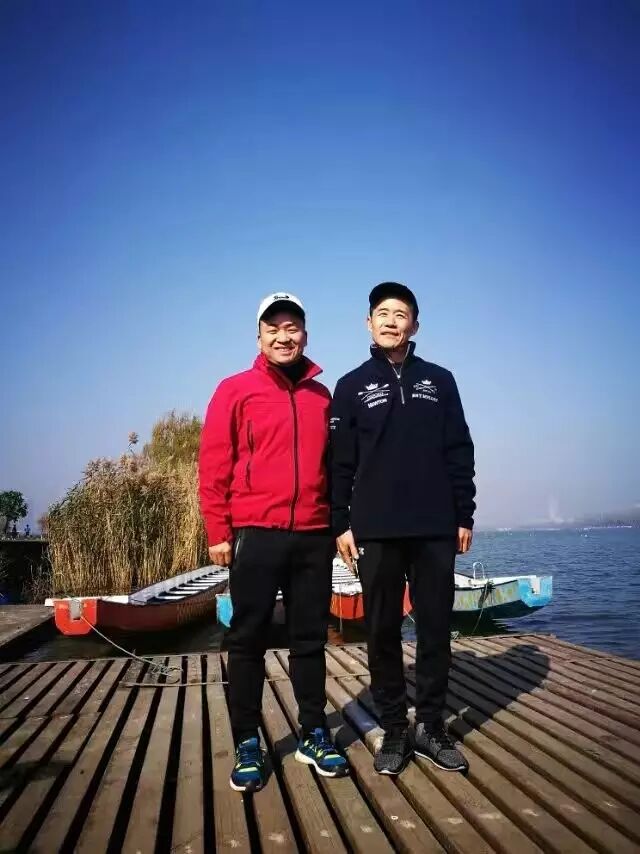 ▲玩转赛艇的粉丝官潘定国,与亚洲赛艇联合会主席王石合影