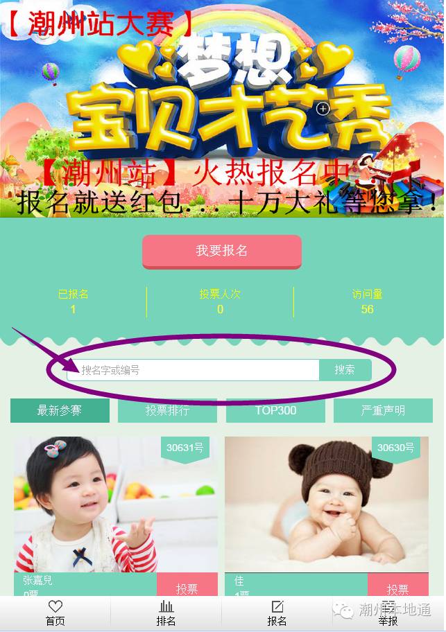 在活动页面搜索框搜宝贝才艺秀“姓名”或“编号”就可以给支持的宝宝投票啦!