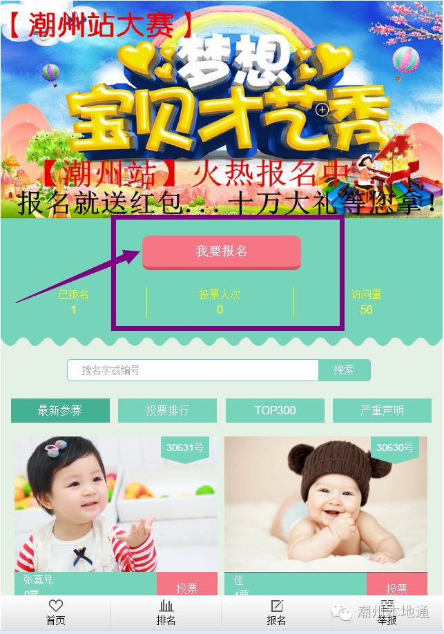2.回复:“萌宝”即可进入活动界面,进入页面后点击我要报名上传照片及信息!