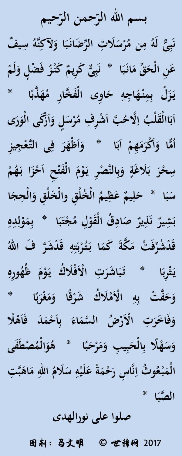 穆圣(愿主福安之)说:“你们当赞颂我,因为你们无论在那里赞颂我,我都能接到你们的赞颂 。”这段圣训说明,应当多赞圣,在任何情况下,赞圣能到在圣人跟前,使圣人高兴。(见《塔志》第二册第174页)。