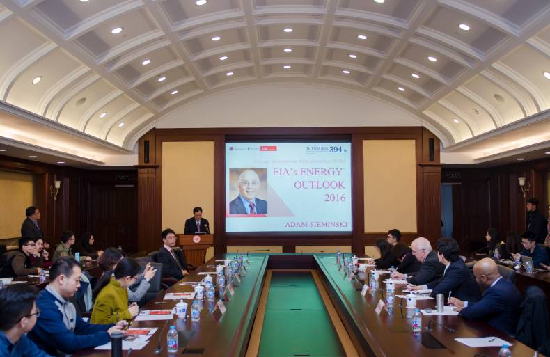 11月8日,由复旦大学经济学院、复旦发展研究院中美友好互信合作计划主办的复旦经济论坛第394期在复旦大学大数据学院会议室举行。美国能源信息署第八任署长Adam Sieminski先生莅临论坛并发表了题为“美国能源信息署能源展望(2016)”的主题演讲,对美国及全球未来能源储备、开采、消费现状和前景进行了介绍和分析。