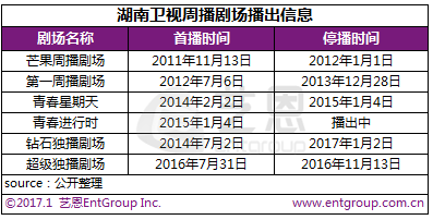 2011年11月13日,湖南卫视首度开辟“芒果周播剧场”,当时周播剧在国内电视界还是一片空白,湖南卫视率先试水周播剧,开创中国周播剧先河,是电视剧制作及频道编播领域的一大创新举措。2012年之后又相继推出“第一周播剧场”、“青春星期天”、“青春进行时”、“钻石独播剧场”、“超级独播剧场”等全新剧场。