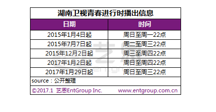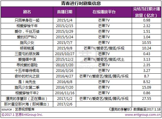 “青春进行时”主要播出青春偶像题材的电视剧,受众以年轻观众为主,据艺恩视频智库显示,目前该剧场已经播出了15部电视剧,网络播放方面, “青春进行时”的剧目在线播放平台大部分以芒果TV独播为主,对比每部剧完结当日的累计播放量,《三里屯的朋友圈》播放量最少,仅为0.43亿次,《旋风少女》、《旋风少女2》、《明若晓溪》三部剧在完结当日播放量均超过10亿次,其中前两部为芒果TV独播。《漂亮的李慧珍》2017年1月2日在湖南卫视“青春进行时”首播,截至2017年1月18日共播出了26集,但网络播放量已高达27.55亿次,成为该剧场目前为止网络播放量最高的电视剧。“钻石独播剧场”被取消,“青春进行时”从2017年1月2日至1月28日,由原来的每周三至周四播出4集改为每周日至周四播出10集,这或许是《漂亮的李慧珍》网络播放量持续走高的原因之一。