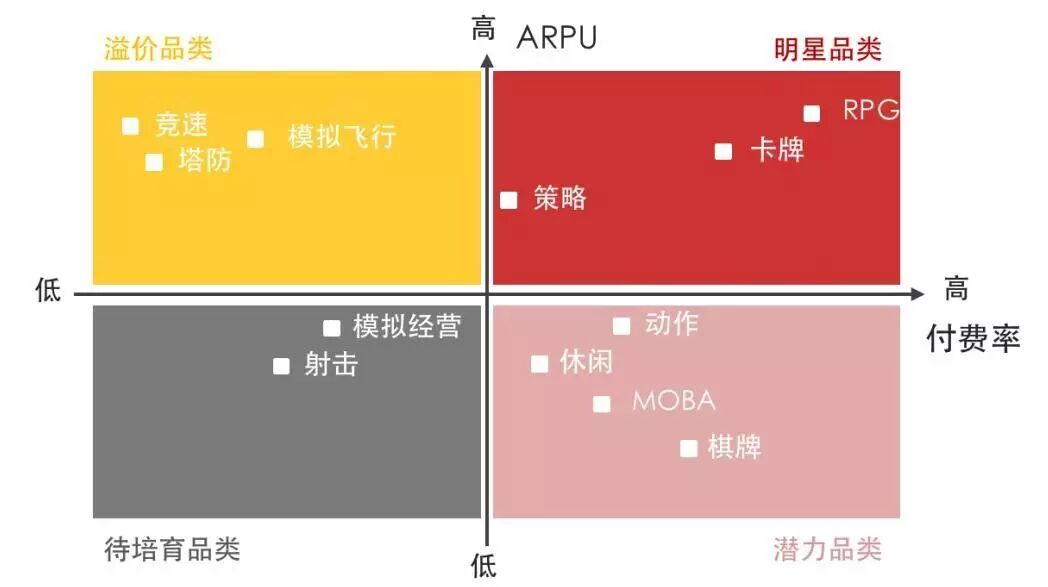 对比重要品类的ARPU和付费率可以看到,RPG、卡牌和策略三类游戏展现出高付费率、高APPU值的“双高”特征;休闲、动作、MOBA、棋牌等类型在付费率方面表现突出,但ARPU相对较低。竞速、塔防、模拟飞行类游戏付费率偏低,但ARPU值则保持较高水平。