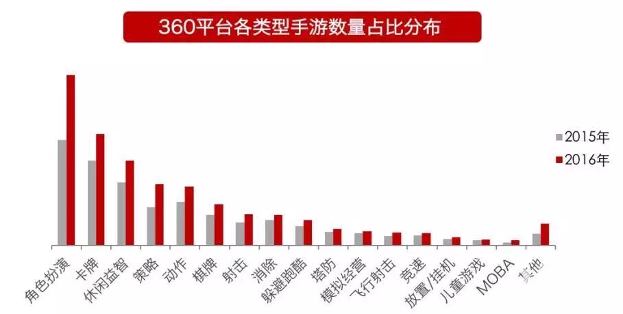 从平台各类型手游数量占比分布看,角色扮演游戏在平台接入游戏中占比最高,同时该类型较2015年增长38%;角色扮演、卡牌游戏、休闲益智三个类型游戏数量占比达到整体的51%,遥遥领先其他游戏类型。2015年各类型游戏在数量上均实现增长,相比2015年,2016年平台手游数量增长41%。