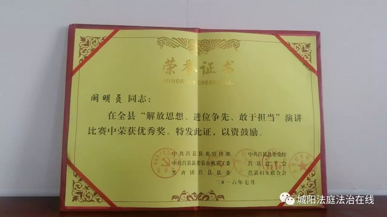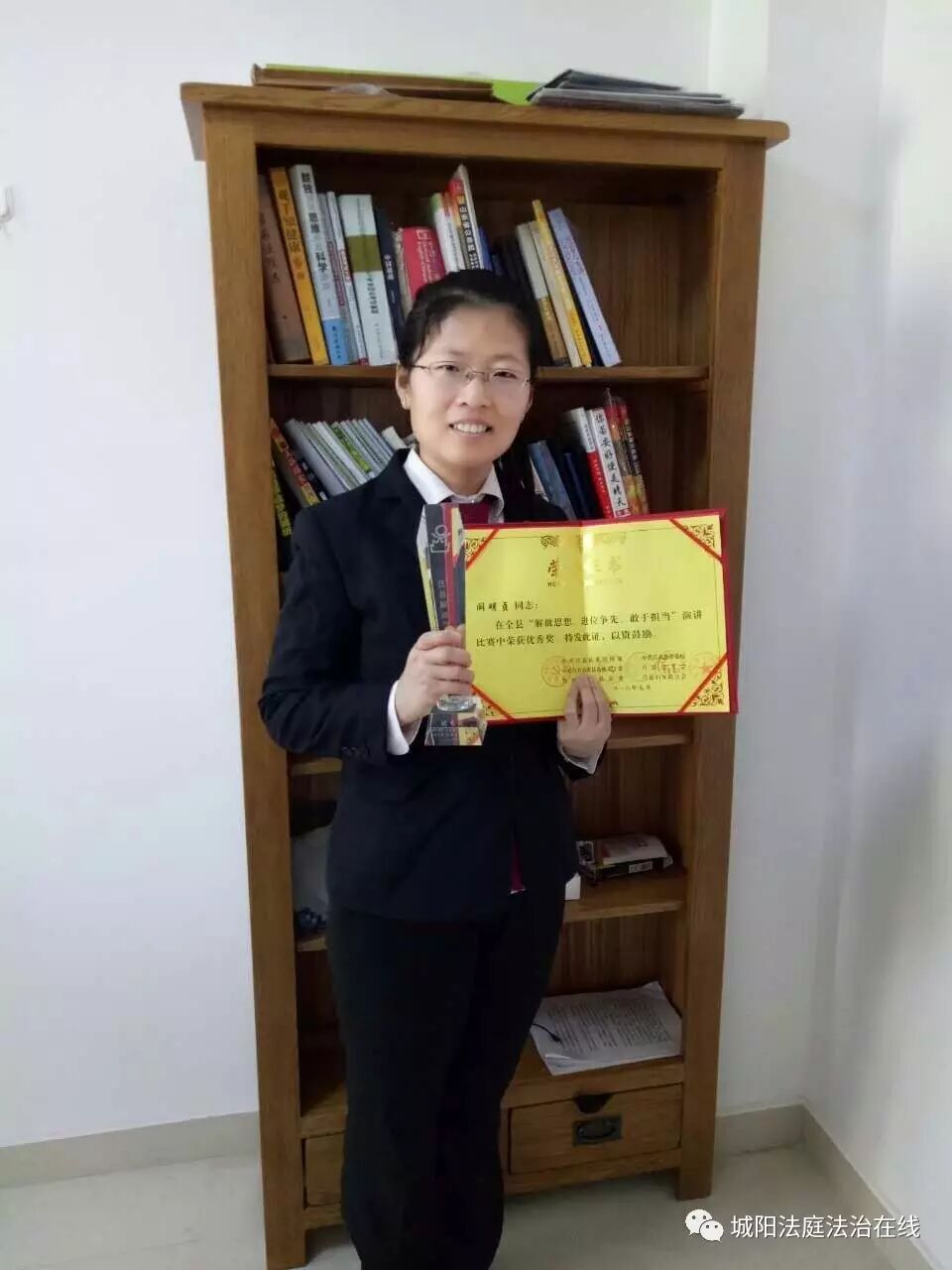 、莒县县委党校等六家单位联合组织的“解放思想、进位争先、敢于担当”演讲比赛活动中,莒县人民法院城阳法庭年轻女法官阚明贞获得优秀奖,她所演讲的题目是《营造和谐稳定的法治环境,护航“一强三名”奋斗目标》(演讲内容详见本公众号2016年11月7日)。近日,县委宣传部给阚明贞法官颁发了奖杯和获奖证书。