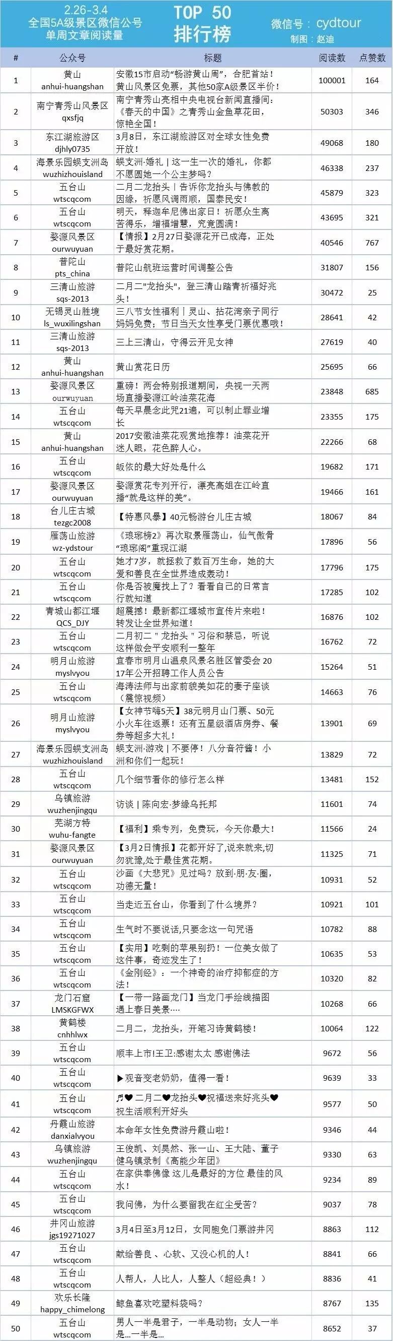 本周位居榜首的文章来自黄山公号,一篇名为《安徽15市启动“畅游黄山周”,合肥首站!黄山风景区免费,其他50家A级景区半价》的文章获得了10万+阅读量。本期上榜的38篇文章阅读总数在1万+以上的文章有49篇。在盛行旅游的今天,除了景点自身的魅力之外,门票的打折优惠、精彩的活动和当季的美景似乎更能吸引大家的眼球。总体看来,能紧贴时事热点,结合自身特色是文章提高阅读量的不二法门。